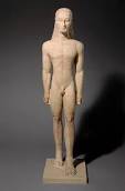 It shows our lovely statue of a youth become a man. How lovely. Appaerently he outgrew his clothes. He seems to be striking a counterpose or controposto: meaning oneknee bent and one hip up. This was the archaic statue style for the Greeks. We can see his rage in the final evolved form. I found these images here and here.
